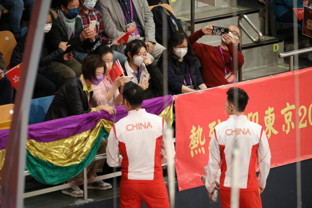 马龙、许昕前去隔着栏杆与张怡宁和郭晶晶