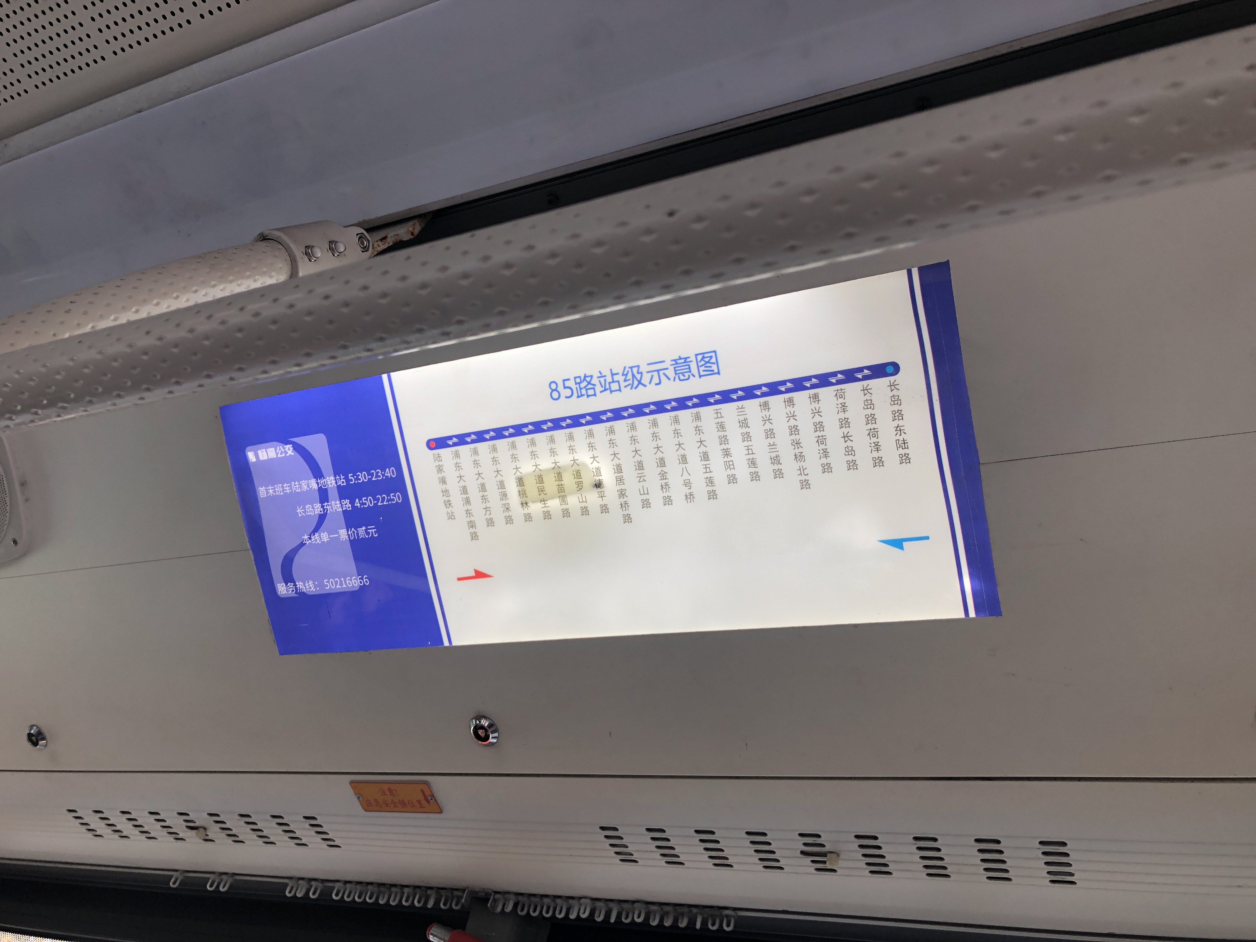 85路公交车内张贴着调整后的公交站点。