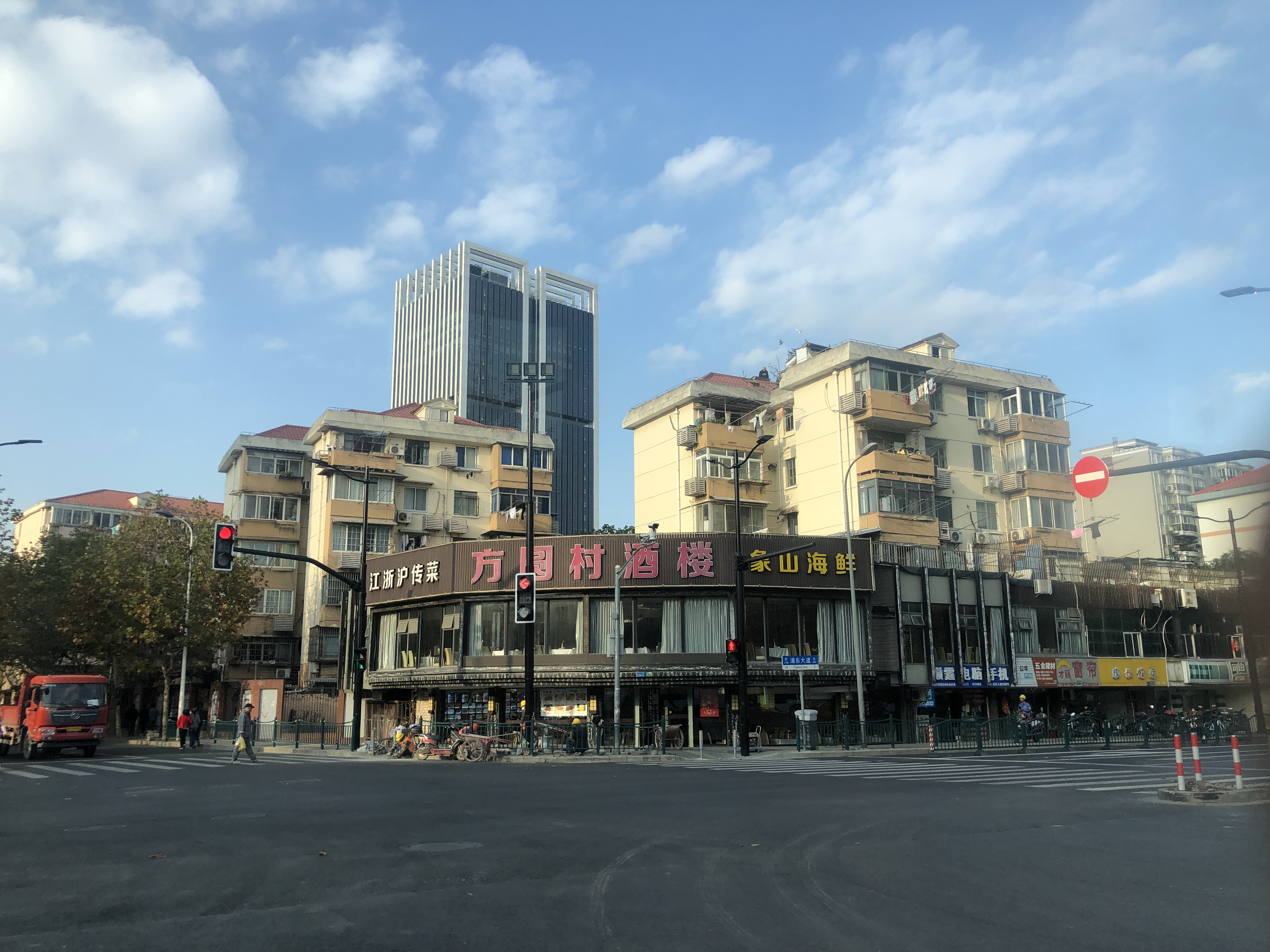 按照85路公交线路,从陆家嘴地铁站出发后,整条路线沿浦东大道一路向北,基本途经整条浦东大道。车辆驶上浦东大道后,双向六车道的设置,让乘客视野立即开阔很多,原先的施工围挡基本消失,路上来往的车辆不多,时不时能看到抢时间施工的工人,或者在验收工程的人。