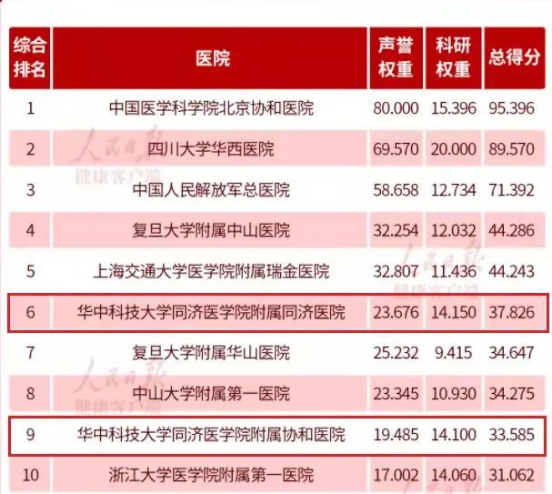 近日,由复旦大学医院管理研究所发布的2020年度《中国医院综合排行榜》和《中国医院专科声誉排行榜》正式出炉。其中,华中科技大学同济医学院附属同济医院和华中科技大学同济医学院附属协和医院均跻身榜单前十,分别位居第6位、第9位。