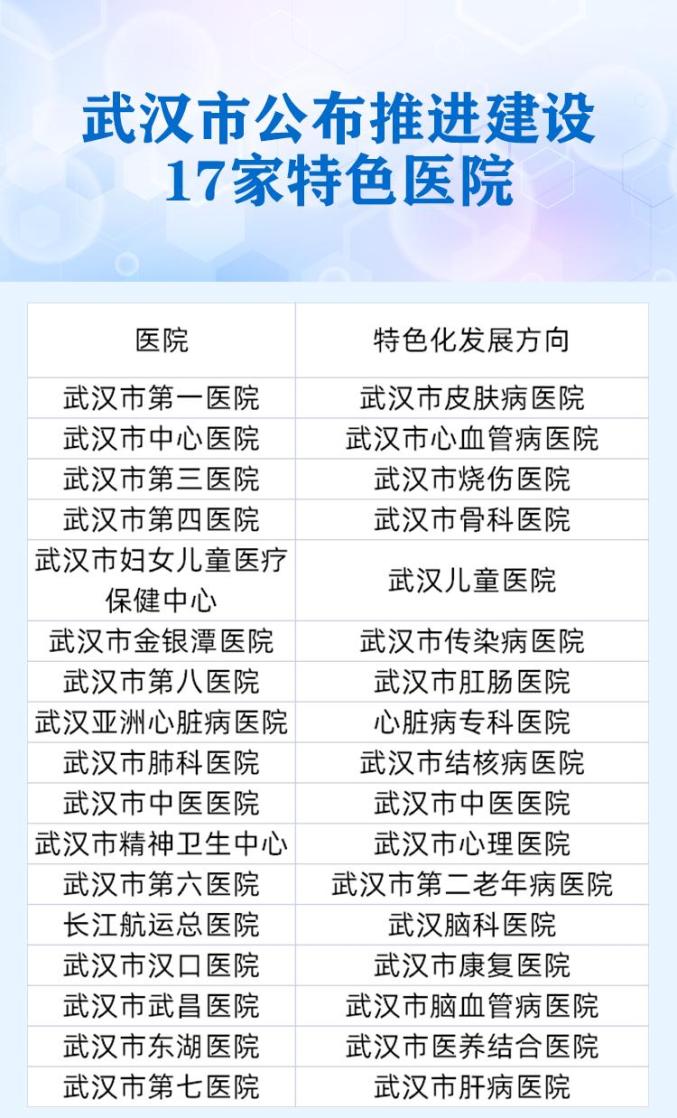 《方案》要求,武汉市第一医院、武汉市中心医院、武汉市第三医院、武汉市第四医院、武汉市中医医院、武汉市汉口医院、武汉市武昌医院、武汉市东湖医院、武汉市第六医院、武汉市第七医院、武汉市第八医院、长江航运总医院等12家医院,要按照“强专科大综合”的发展思路,分别在皮肤、心血管、烧伤、骨科、中医药、康复、脑血管病、医养结合、老年医学、肝病、肛肠、神经外科领域诊疗能力、慢病防控、临床研究以及转化能力等方面实施特色化建设,达到全国先进水平,辐射带动区域内整体医学水平提升。