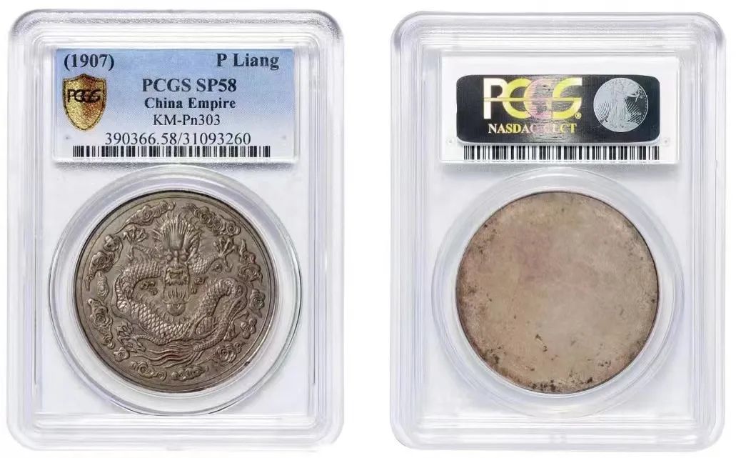 SP58,KM-Pn303,马定祥旧藏,仅见孤品丙午丁未大清金币均常见于各大钱币拍卖,而银质丁未试铸样币,目前海内外仅见此枚,比大清金币更为珍贵。本件拍品为银质单面样币,为民国著名银币收藏家马定祥所藏。大清金币原为清政府为筹款而铸,光绪三十二年由天津造币总厂正式试铸。该币面中间有楷书“大清金币”四字,上端有“光绪丙午年造”,下端有“库平一两”字样,背面蟠龙,四周绕有云纹及光边。次年造币厂又试铸了“光绪丁未年造”的金币,除正面的铸造年份不同,背面的龙图、云纹、线圈无异。后因大清政府认为国库藏金有限,金币最终未能流通。