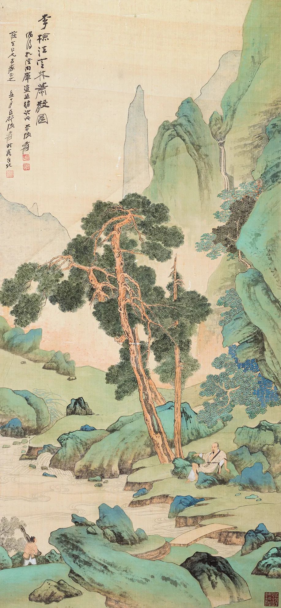 40年代中后期正值张大千年富力强之时,是其敦煌之行、倾囊搜购历代名迹后的集大成时期。《李检法定林萧散图》便作于此时,是张大千力追北宋山水画高峰期的得意之作,也是其平生仿古的巅峰之作。此作材质为乾隆时期内府所藏特制双丝细绢,殊为难得。上款人于葭生是民国时期政界经济、金融领域要员,曾与蒋经国、陈立夫、戴季陶等国民政府政、军界名流交往密切,在当时有着很高的社会及政治地位,与唐醉石等文化界名人亦多有交游。