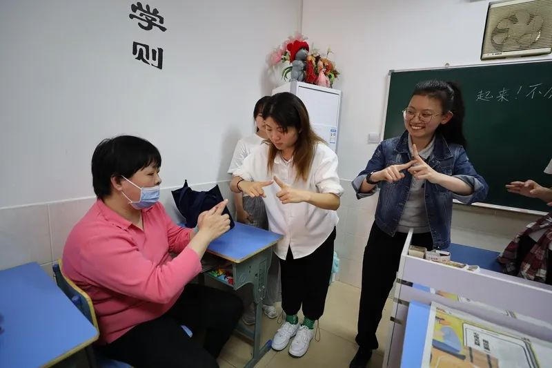 上应大特教生在徐汇田林街道“阳光之家”给残障人士上手语课。