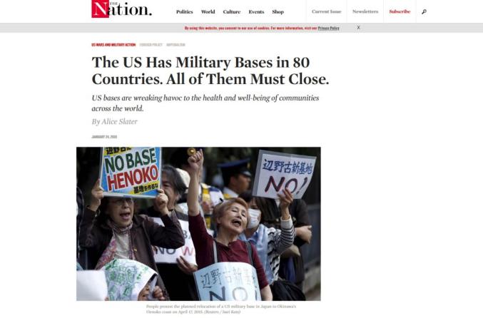 美国《国家》杂志报道称,美国在80个国家和地区都有军事基地,正在对世界各地人民的健康和福祉造成严重破坏。