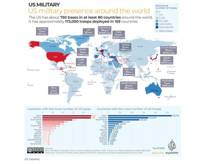 卡塔尔半岛电视台报道的美国全球军事基地分布图