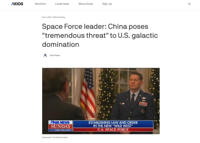 有意思的是,美国“Axios”新闻网相关报道的标题是:“太空军将领:中国对美国主导星系构成‘巨大威胁’。”