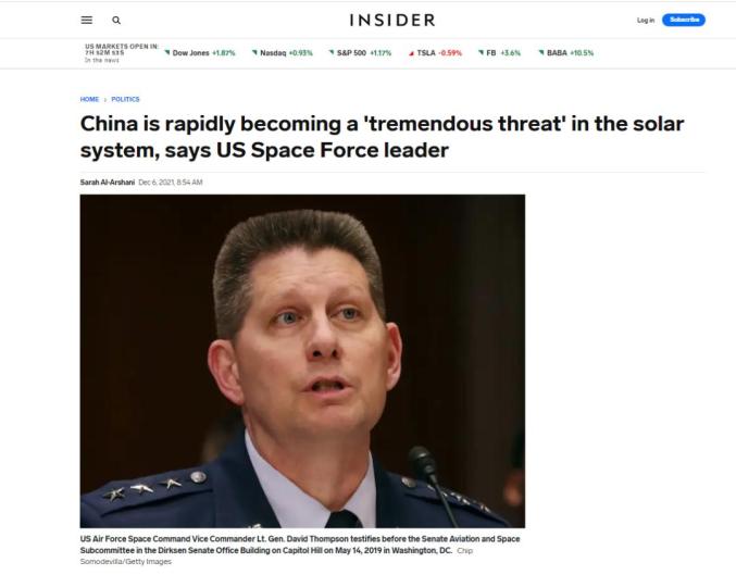美国“商业内幕”网写道:“美太空军将领表示,中国正在快速成为‘太阳系’的‘巨大威胁’。”