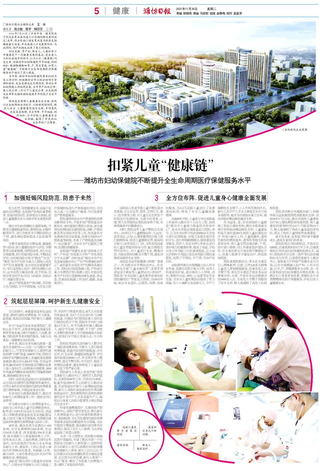 2021年7月20日《中共中央 国务院关于优化生育政策促进人口长期均衡发展的决定》发布,作出实施三孩生育政策及配套支持措施重大决策,开启我国人口发展新阶段。与此同时,助产机构也迎来了更大的挑战。妇女生殖、孕产妇、新生儿、儿童和青少年健康是下一代健康发展的基石,是未来人口和社会进步的动力。11月10日,《健康报》刊发文章,对潍坊市妇幼保健院节节相连、环环相扣,做强做精做细孕、产、育生育线,扣紧儿童“健康链” ,不断提升全生命周期医疗保健服务水平进行了深入报道。