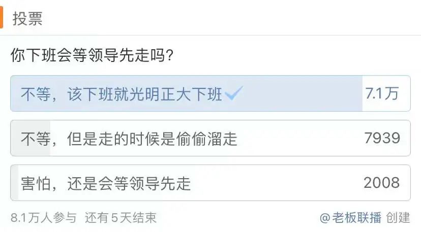 微博平台上的投票更明显地反映出,这届年轻人绝大多数都想准时下班。