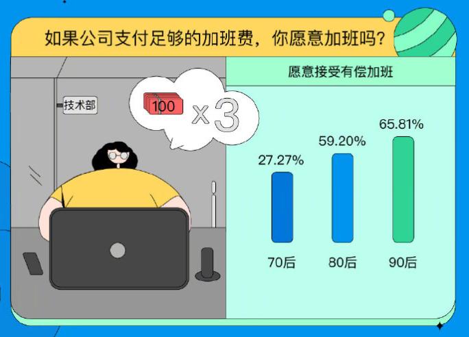 同时,很多人有一个苦恼:下班之后可能还有工作要做。对于这个情况,有超7成90后表示不管领导下不下班都会直接走,但任务来了依然会负起责任。但是,多数人愿意加的班,是给加班费的那种哦。