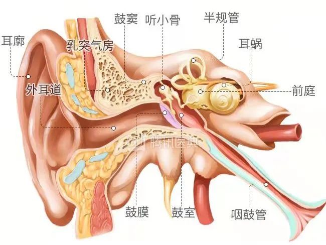 人耳结构示意图丨腾讯医典从上图我们可以看到,耳朵可以简单分为外耳、中耳、内耳三个部分。