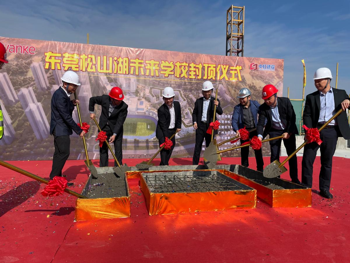 东莞松山湖未来学校作为市委、市政府高起点部署建设的市直属公办完全中学,建设进程吸引着各界的目光。东莞松山湖未来学校封顶仪式在学校项目六区学生宿舍楼顶举行。市委教育工委委员、市教育局党组成员、副局长王健,松山湖城建局工程管理科科长李燕辉,松山湖未来学校校长万飞,市教育局规划建设科和代建、设计、勘察、监理、施工等单位负责人,以及松山湖未来学校种子教师团队等参加封顶仪式。王健在封顶仪式致辞指出,松山湖未来学校自今年4月正式动工以来,各方积极协调沟通、通力合作,项目建设顺利高效推进,学校项目正式封顶,是学校筹办过程中的又一个重要阶段性事件。他要求落实好市委、市政府的统筹部署和任务要求,下来一方面要继续严把质量关,加强安全管理,落实好工程监理、质量验收等要求,确保工程质量经得起历史和时间的检验,另一方面要进一步加强师资队伍培育,加大课程设计研究力度,做好开学各项准备工作,为学校高起点办学奠定坚实基础。