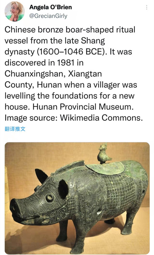“中国商朝晚期(公元前1600年-1046年)的猪形铜尊,1981年湖南湘潭县船形山村民在为新房打地基时被发现,现存于湖南省博物馆。”
