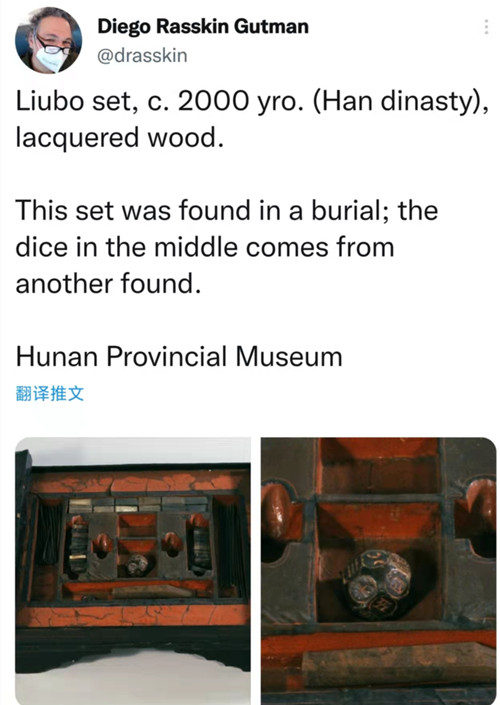 “六博棋,大约有两千年左右的历史(汉代),由漆木制成。该棋盘在一个墓葬中被发现。中间的骰子是在另一次的清理中发现的。现藏于湖南省博物馆。”