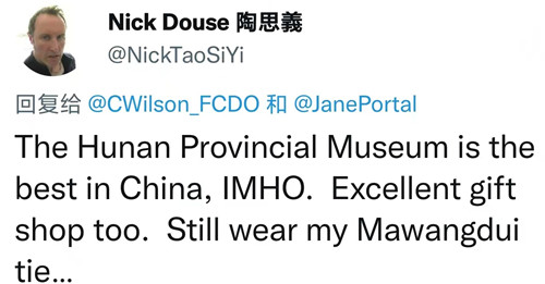 “在我看来,湖南省博物馆是中国最好的博物馆,礼品店也很不错。我现在仍然戴着我的马王堆领带”。