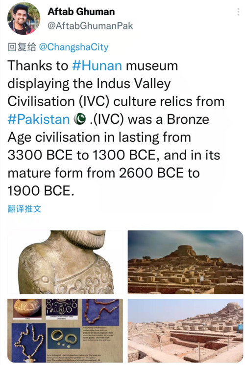 “感谢湖南省博物馆展示印度河流域文明的文化遗产。印度河流域文明是一个位于今天巴基斯坦境内的青铜时代文明,持续时间从公元前3300年至公元前1300年,在公元前2600年至公元前1900年达到鼎盛。”