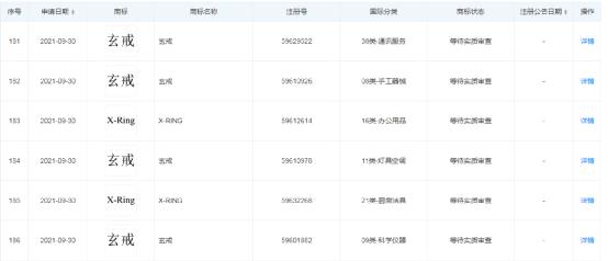 今年9月,小米科技有限责任公司申请注册了一系列“X-RING”、“玄戒”商标,国际分类涉及通讯服务、机械设备、网站服务、运输工具、科学仪器等,目前处于等待实质审查阶段。