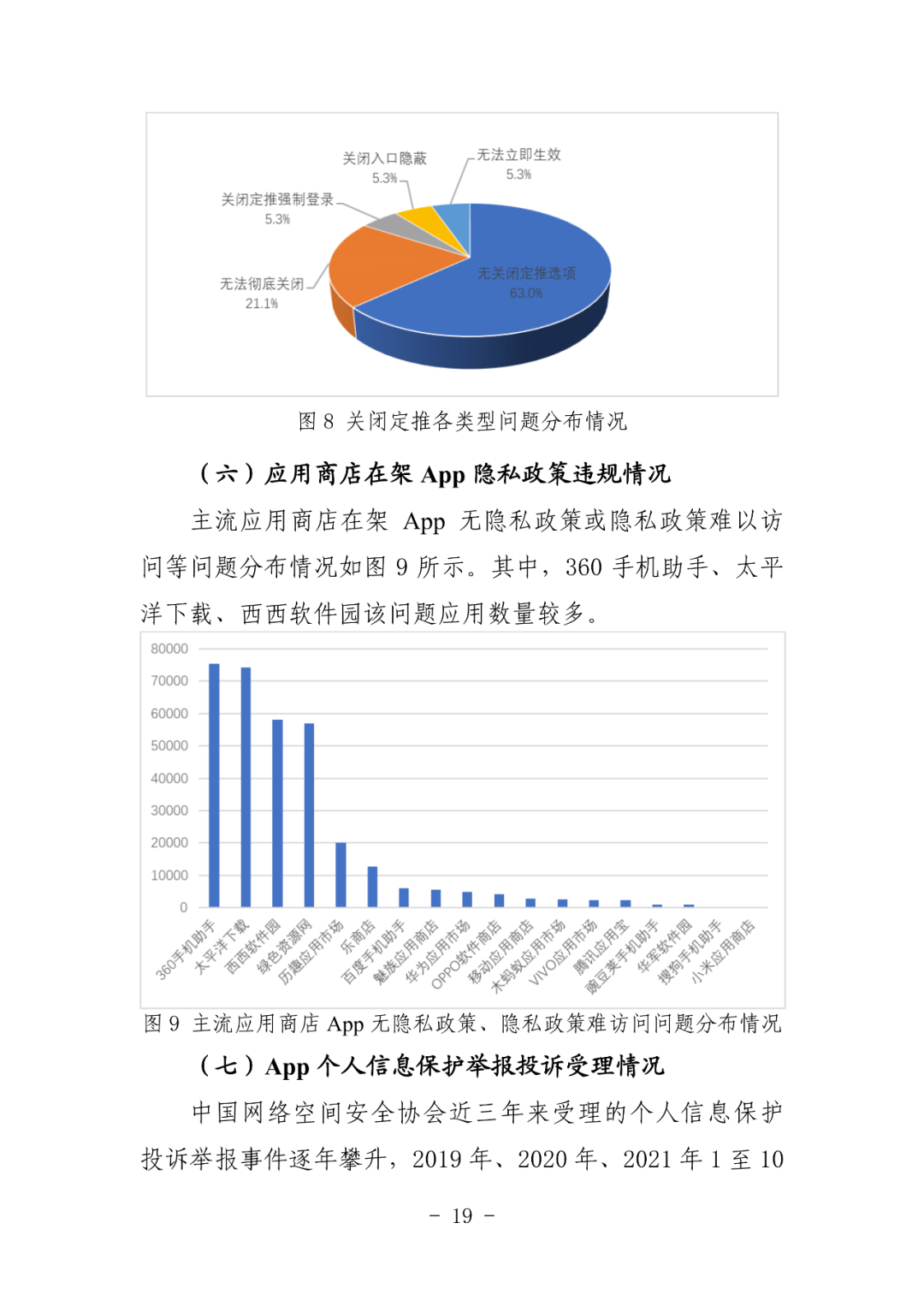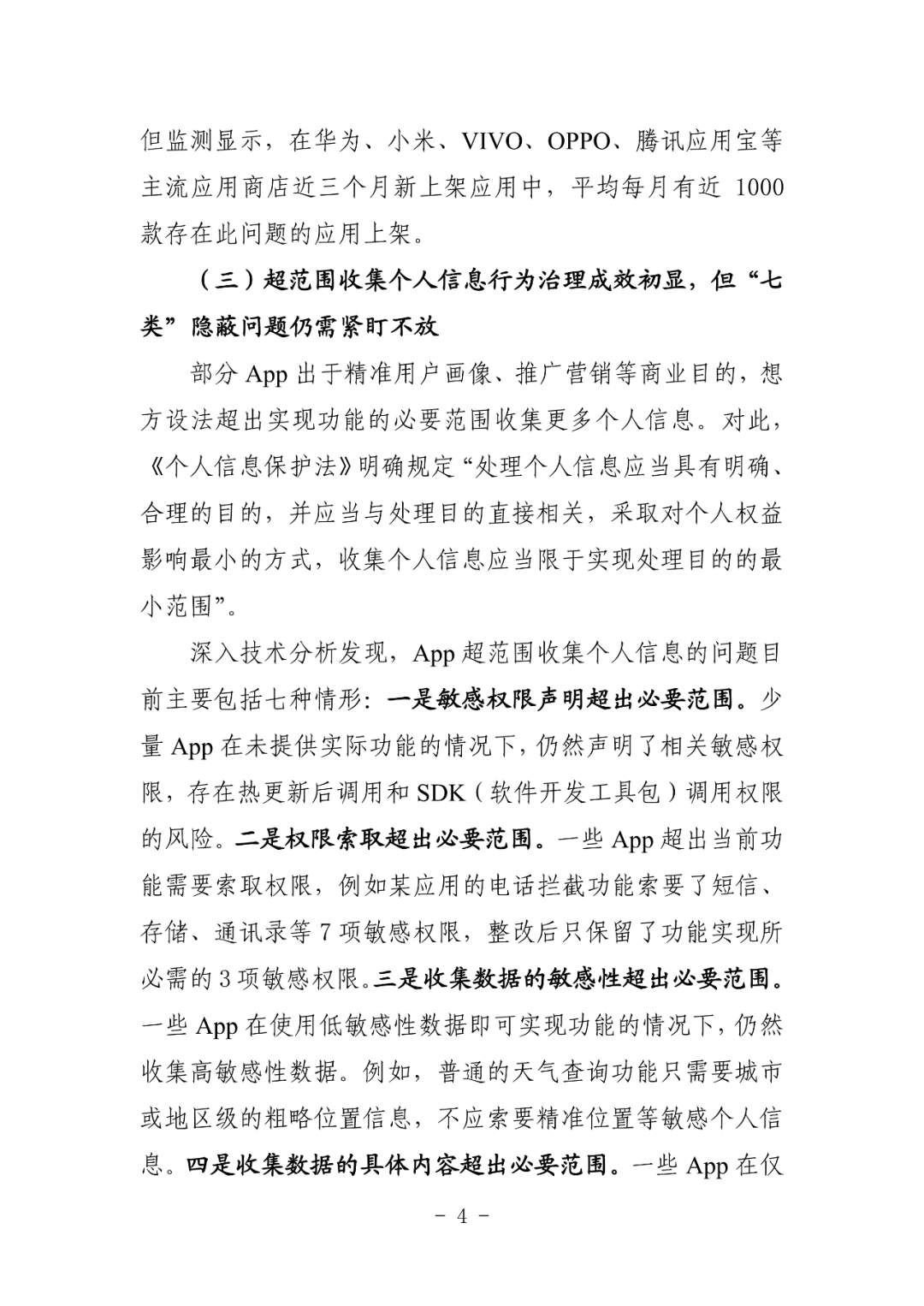一是App收集使用个人信息总体状况。从9个方面进行态势分析和问题阐述,包括依法治理、强制收集、超范围收集、知情同意、隐私政策、明示告知、SDK收集、账号注销、社会监督等。