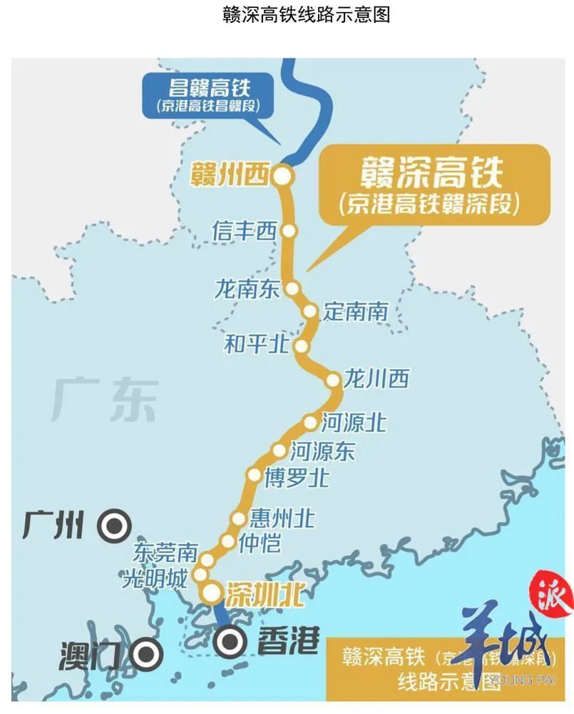 京港高铁赣深段北起江西省赣州市,南至广东省深圳市,途经江西省赣州市和广东省河源、惠州、东莞、深圳等地市,线路全长434公里,设计时速350公里,全线共设赣州西、信丰西、龙南东、定南南、和平北、龙川西、河源北、河源东、博罗北、惠州北、仲恺、东莞南、光明城等车站,其中赣州西站、光明城站为既有车站。