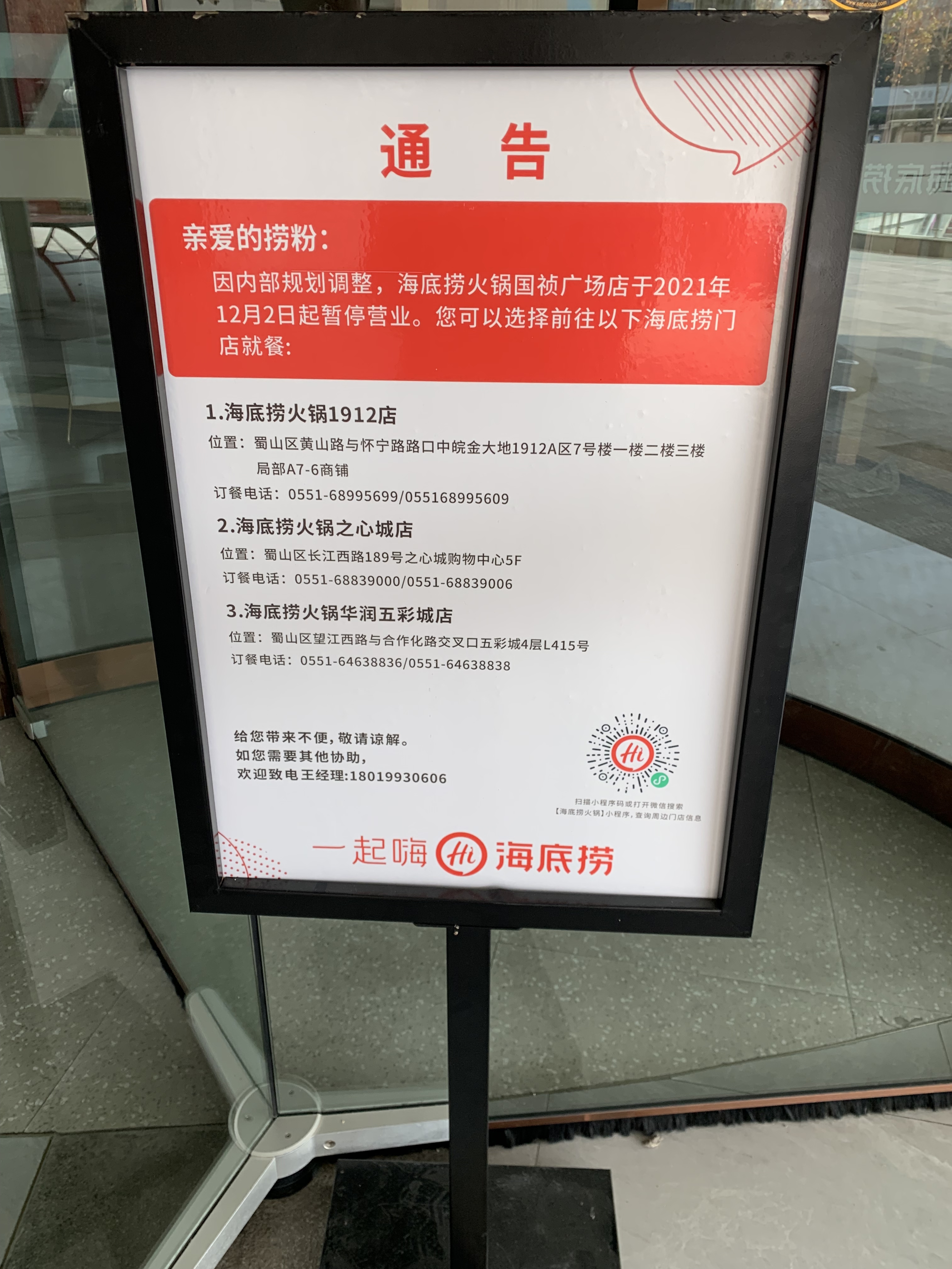 在国祯广场 店门口,记者看到了一张通告。通告称,“因内部规划调整,海底捞火锅国祯广场店于2021年12月2日起暂停营业。”顾客可以前往1912店、之心城店、华润五彩城店就餐。