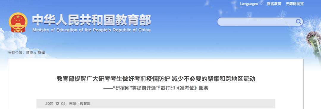 12月9日,教育部发布公告,为方便考生尽早了解报考点考试、防疫相关信息和要求,提前做好相关准备,“研招网”将原定于12月18日开通的考生下载打印考研准考证服务提前至12月10日,下载打印方式不变(考生凭用户名和密码登录“研招网”下载,网址:https://yz.chsi.com.cn)。