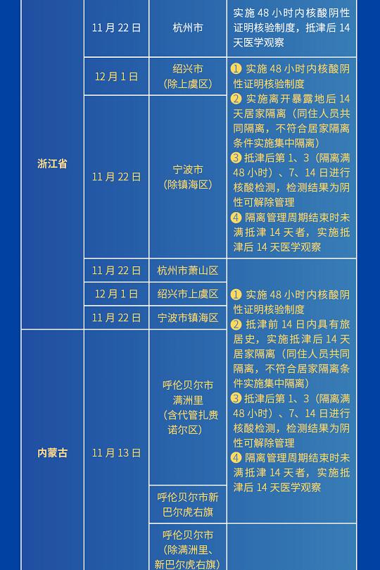 新增具有12月1日(含)以来途经绍兴市(除上虞区)、11月22日(含)以来途经宁波市(除镇海区)旅居史的来津及返津人员,需持48小时内核酸阴性证明或出示包含核酸检测阴性信息的健康码“绿码”,主动向社区、工作单位等报备,实施离开暴露地后14天居家隔离(同住人员共同隔离,不符合居家隔离条件实施集中隔离),隔离管理周期结束时未满抵津14天者,实施抵津后14天医学观察。