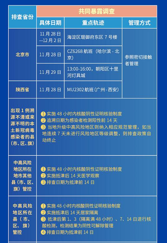 当地出现1例溯源不清或来源不明的本土新冠病毒感染者时,具有其所在县(市、区、旗)旅居史人员实施48小时内核酸检测阴性证明核验制度,追溯日期为感染者检测阳性前14天,如当地升级中高风险地区则纳入相应规范管理,如当地连续7天未进行风险地区等级调整,则排查政策自动终止。