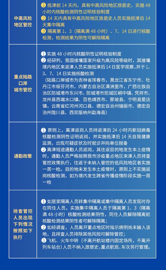 抵津前14天内,具有中高风险地区所在地市或陆地边境口岸城市旅居史的人员实施48小时内核酸检测阴性证明核验制度,14天内具有中高风险地区旅居史人员实施抵津后14天集中隔离,具有中高风险地区所在县(市、区、旗)旅居史人员实施抵津后14天居家隔离,其他人员实施14天医学观察。