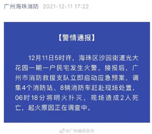 据广州海珠发布的官方微博通报,12月11日5时许,广州海珠区沙园街道光大花园一期一户民宅发生火警。接报后,广州市消防救援支队立即启动应急预案,调集4个消防站、8辆消防车赶赴现场处置,6时18分将明火扑灭,现场造成2人死亡,起火原因正在调查中。