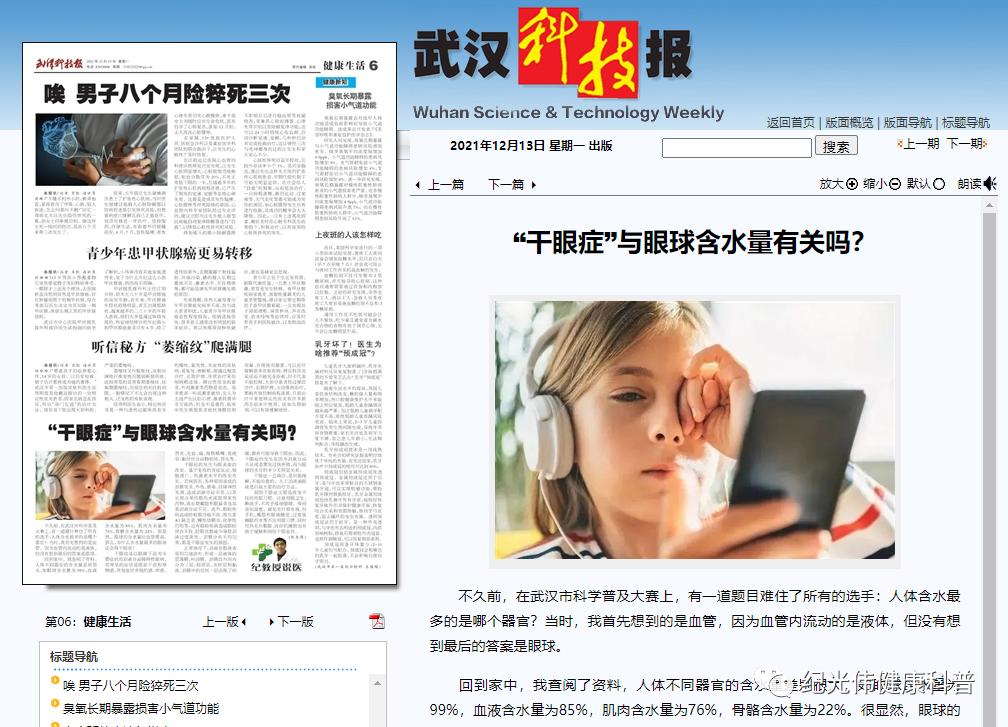 不久前,在武汉市科学普及大赛上,有一道题目难住了所有的选手:人体含水最多的是哪个器官?当时,我首先想到的是血管,因为血管内流动的是液体,但没有想到最后的答案是眼球。回到家中,我查阅了资料,人体不同器官的含水量差别很大,如眼球含水量为99%,血液含水量为85%,肌肉含水量为76%,骨骼含水量为22%。很显然,眼球的含水量比血管要高。那么,为什么含水量最多的眼球还会得干眼症?