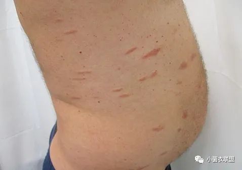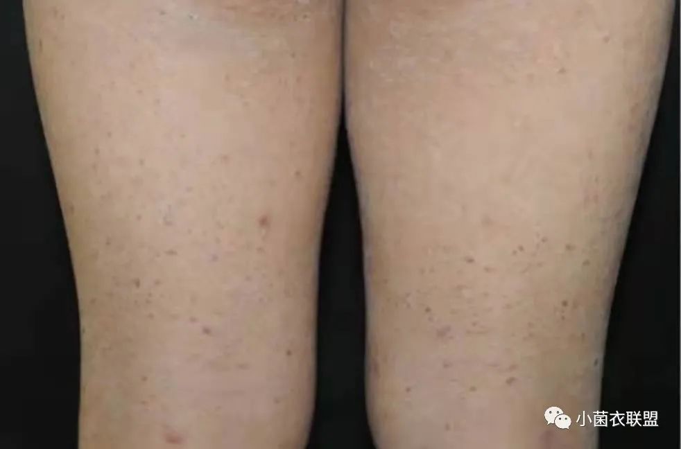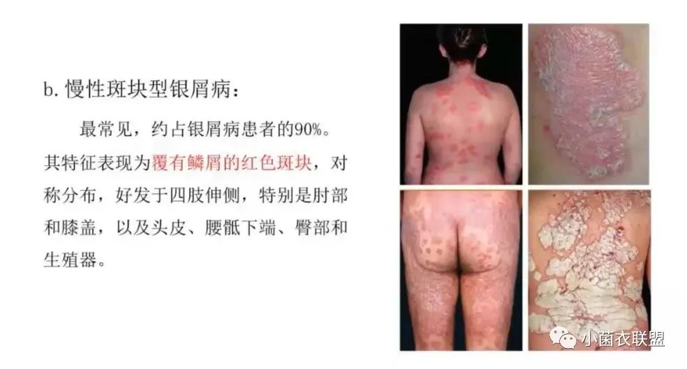 1.小斑块型副银屑病,主要见于中老年患者,男性多于女性,表现为圆形、椭圆形或长条状界限清楚的淡红斑或色素减退性斑片或薄斑块,上覆少许鳞屑,质地软,有蜡样光泽。皮损直径1~5cm,常对称分布于躯干和四肢近端,沿皮肤张力线排列,面部和掌跖一般不受累。病程慢性,持久不退。一般无自觉症状。