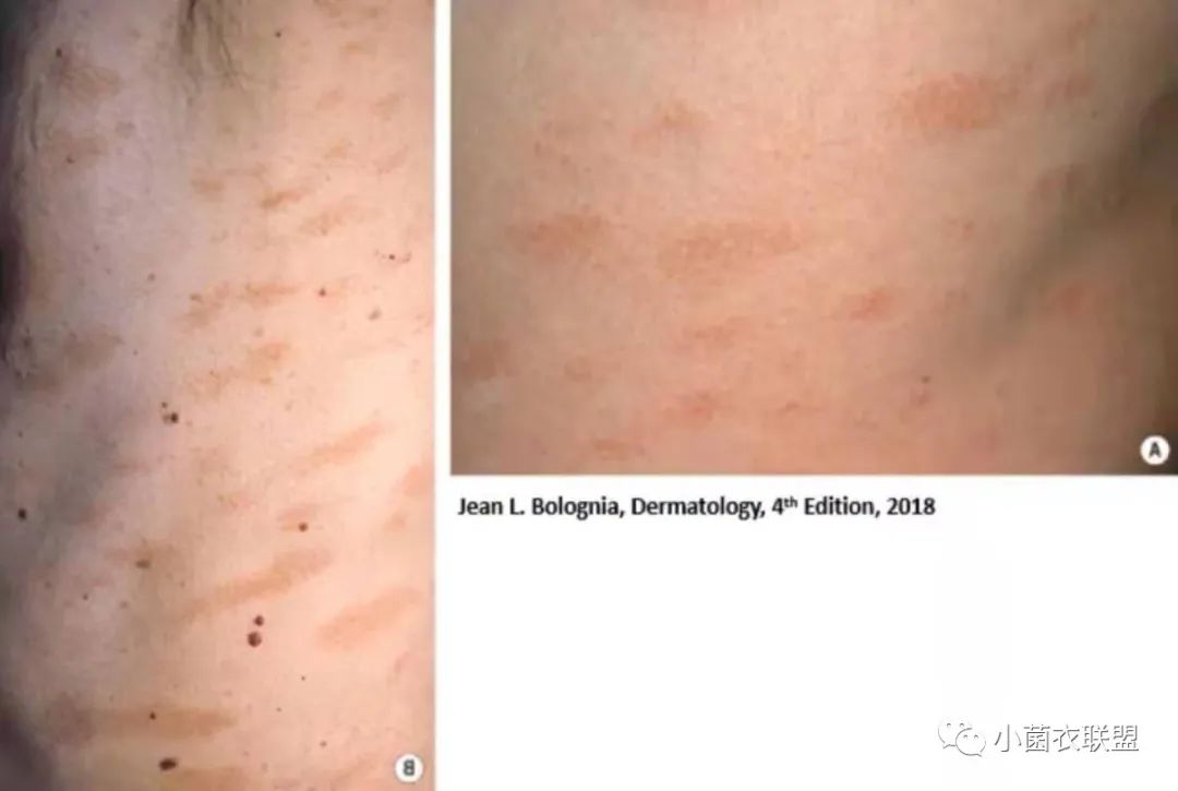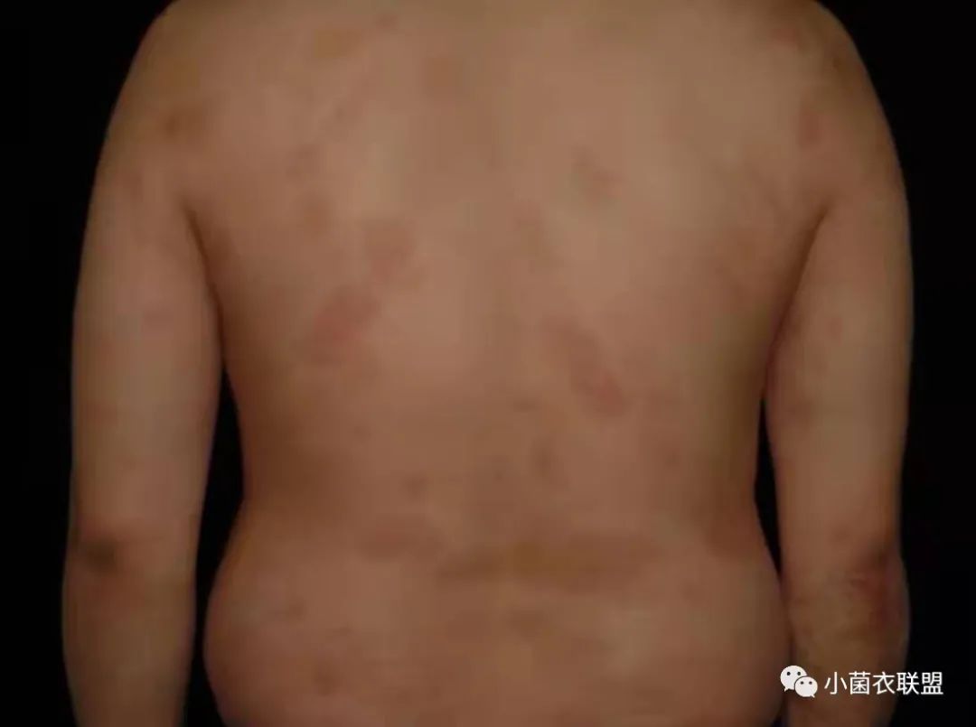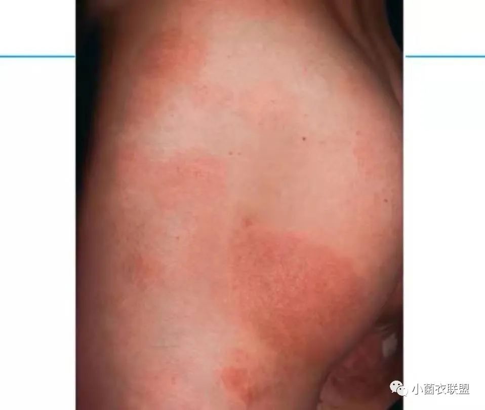 2.大斑块型副银屑病,主要见于中老年患者,男性多于女性,皮疹好发于臀部、腋窝、躯干及四肢屈侧,表现为境界相对清楚的淡红色、黄红色斑片或薄斑块,呈圆形、椭圆形或不规则形,上覆少许鳞屑,无点状出血现象,多数皮损直径5~10cm,无自觉症状或微痒。目前认为该病是早期蕈样肉芽肿(MF)的表现。皮损可呈现血管萎缩性皮肤异色症的表现。病程慢性,皮疹一般不会自行消退。