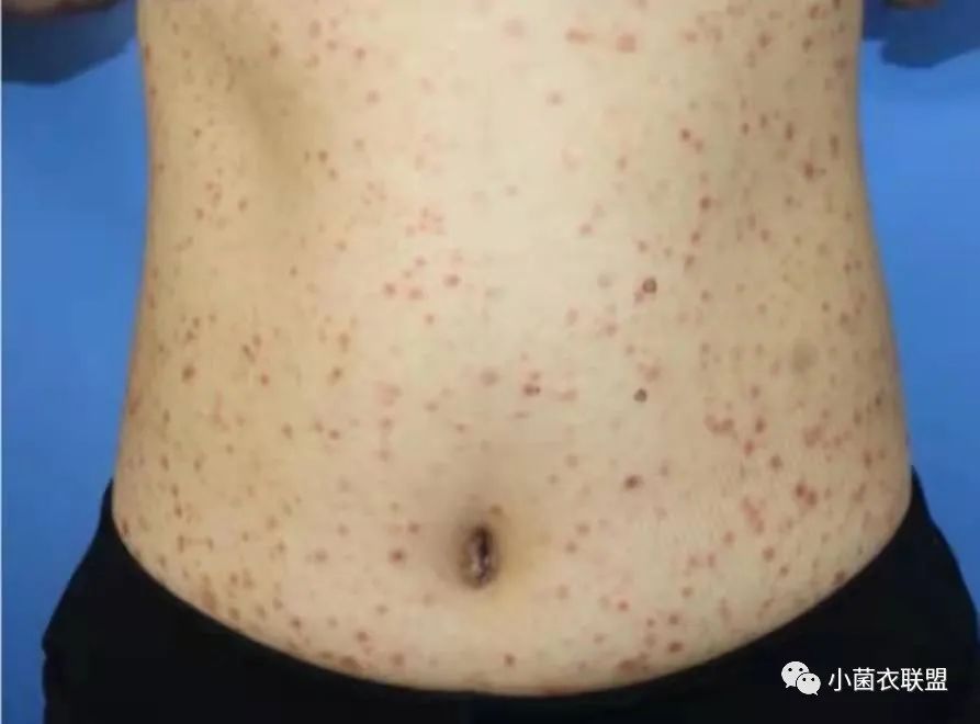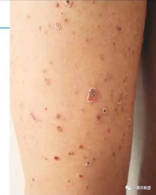 3.急性痘疮样苔藓样糠疹,又称痘疮样副银屑病、急性点滴状副银屑病,好发于儿童和青少年。起病急,皮疹常突然出现于躯干、四肢、臀部,屈侧多见,掌跖、面部、黏膜部位较少累及。表现为密集或散发的红色水肿性丘疹,中央可形成水疱、脓疱,甚至出血、坏死、结痂。一般在4周至半年自然消退,部分患者数年不愈。一般无自觉症状,偶有瘙痒。