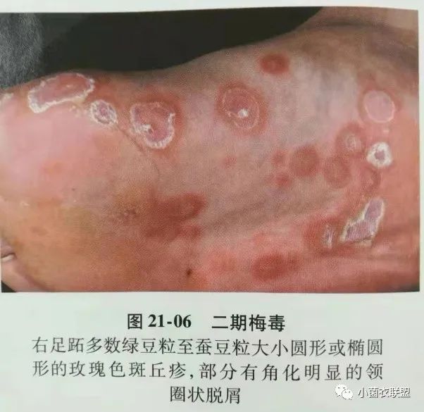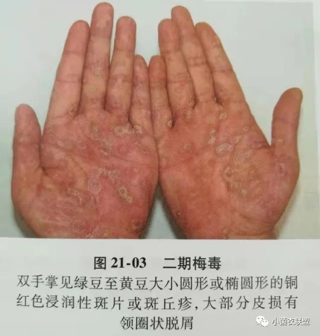 2.梅毒疹,皮损广泛对称,常累及掌跖,有黏膜损害、全身淋巴结肿大,梅毒血清反应阳性。