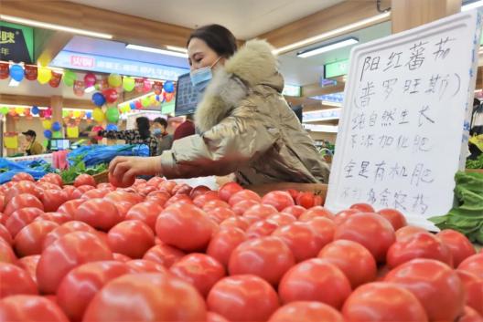 而在平价菜专柜斜对角的另一家蔬菜档口,网红水果西红柿“普罗旺斯番茄”摆在醒目位置,“错位经营”的理念可见一斑。正是在这样的业态搭配互补下,消费者手里的“菜篮子”货丰价优,入驻商户收获旺盛人气。