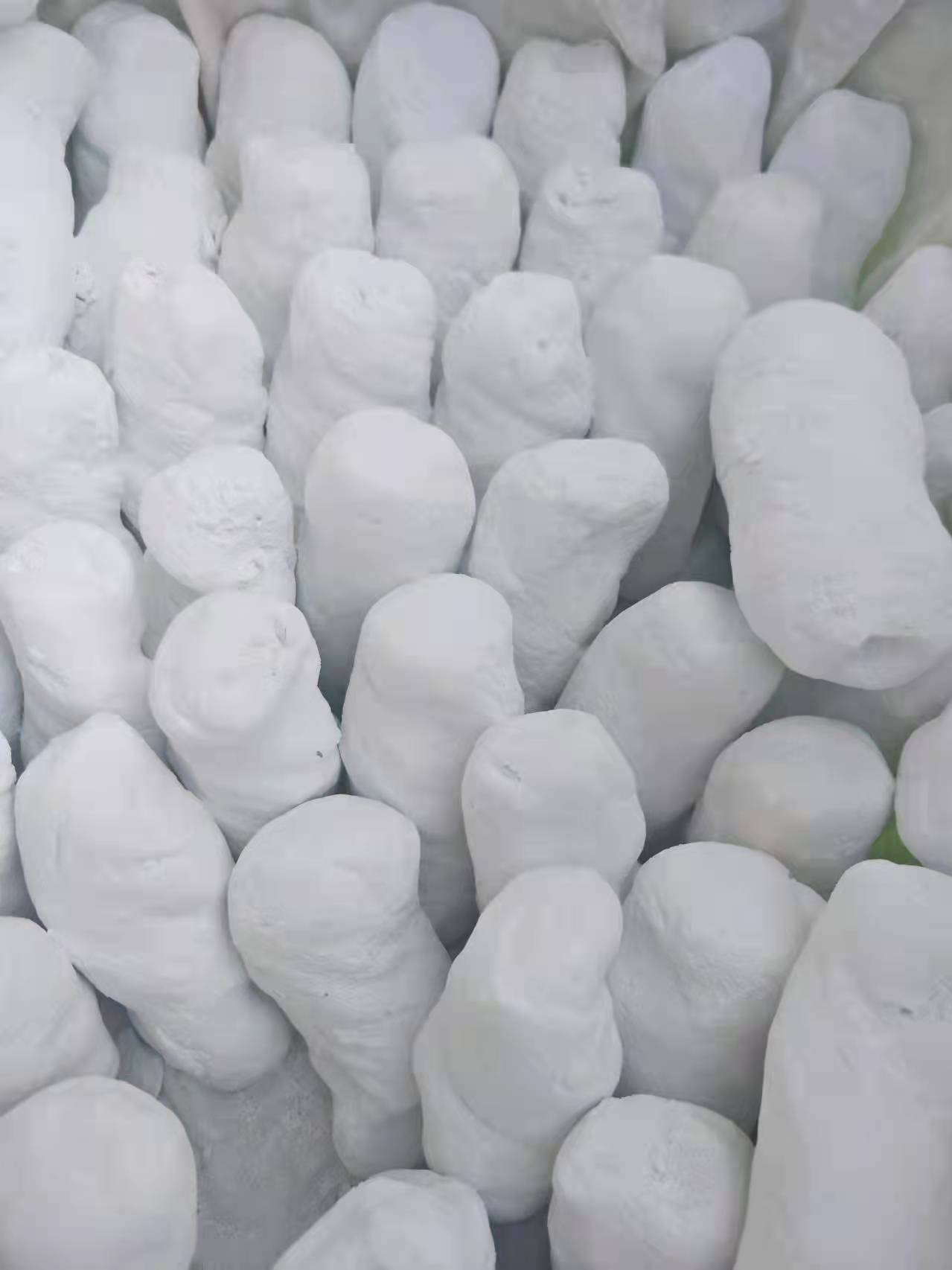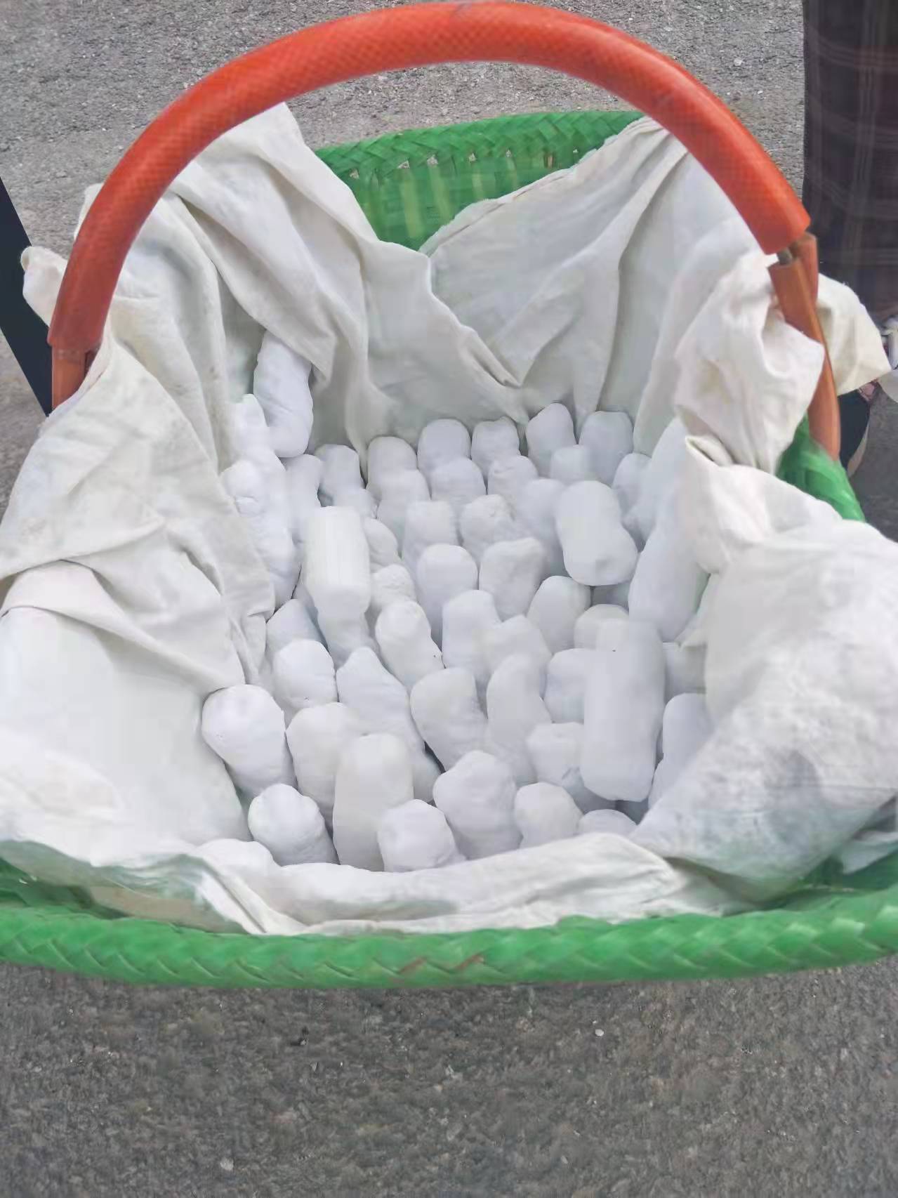 据当地“粉匠”介绍,“饽饽粉”制作主要有三道工序:第一“采矿”,即从矿洞里挖出“白泥”粉渣。粉子洞均是有矿脉的,通过老辈手艺人流传下来的经验或懂粉矿的人探查,先找到矿脉方向和适合开采的点,用二三十公分长的镐头、铲子等工具把表层的矿泥收拾一下,慢慢凿出洞口。猫着腰顺矿脉方向一点点手工采掘,进洞后有时得半蹲着边抠边挖,浅时三四米,深时一两丈开外,不过挖得太深粉渣硬度大质量并不高。抠出后的粉矿原料纯度不一,往往八成粉渣,两成纯粉,颜色雪白,偶有白里带暗红的次粉渣,一般不好卖就挑出来丢掉,体量1公分到5公分不等,最小的又称“面子粉”。用铲子慢慢装入尼龙袋子,扎好口小心翼翼运出洞,顺着山路扛回家,整个过程是个体力活,非常辛苦,一干就是大半天,有时需要带上干粮在洞内吃晌饭。
