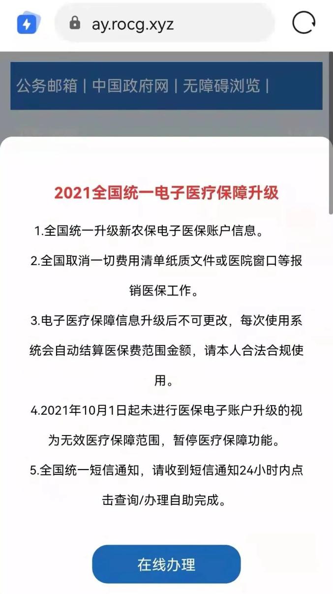 昨日凌晨,小邓手机上收到一条短信:【人社通】您的医保已停用,点ay.rocg.xyz申换电子版使用。