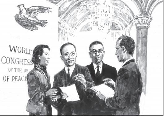 抵达布拉格后,代表团得知大会有一个规定:开幕式那天各国代表团入会场时,都要奏本国国歌。这让大家感到为难。当时新中国还未成立,国歌也没有选定。代表团团长郭沫若大胆提出:就唱《义勇军进行曲》。