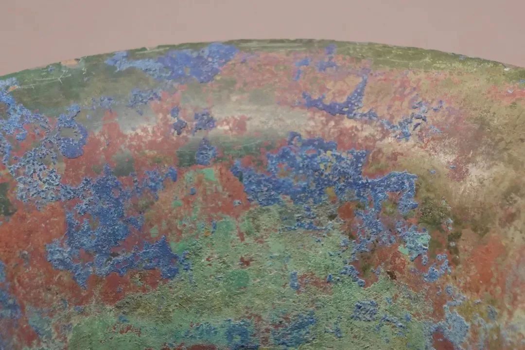 张珮琛:青铜器刚刚制造时是金光闪闪的,因此被古人称为“金”或“吉金”,其颜色与我们现在所看到的黄铜不太一样,黄中带有偏红的颜色,更接近于现在的玫瑰金。铜是比较活跃的金属,若不去经常擦拭和使用,铜很快会以肉眼可见的速度变暗氧化,俗称“生锈”。所以在过去使用铜镜的时候,会有磨镜工这个职业。铜生锈后形成氧化铜,青铜器受到不同埋藏环境等影响,形成我们现在看到的不同地区出土青铜器五彩斑斓的颜色,其锈蚀颜色几乎涵盖了整个色谱:赤、橙、黄、绿、青、蓝、紫、黑、白。长江中下游地区水位线比较高,青铜器埋藏的环境较为潮湿,长期的腐蚀会形成南方特有的鲜艳厚实的氧化层,北方地区如陕西、山西、甘肃、河南的气候和埋藏环境较为干燥,有些窖藏青铜器甚至根本就没有接触过土壤,所以有很多窖藏青铜器出土时会呈现神奇的金铜色。