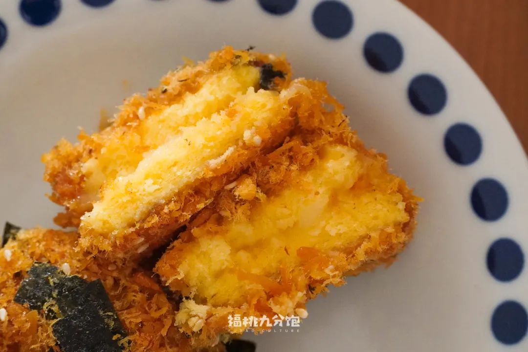 这种点心因制作难度不高,已经成为了每家点心店的常规产品,外层裹的肉松+海苔片和镇店头牌中麻薯老虎卷所用的相同,海苔和肉松干爽酥脆,沙拉酱涂得克制,薄薄一层不会感到黏腻。相比老虎卷中所用的虎皮蛋糕,脆苔小贝中的蛋糕胚更为绵软,口感的层次也就更丰富。