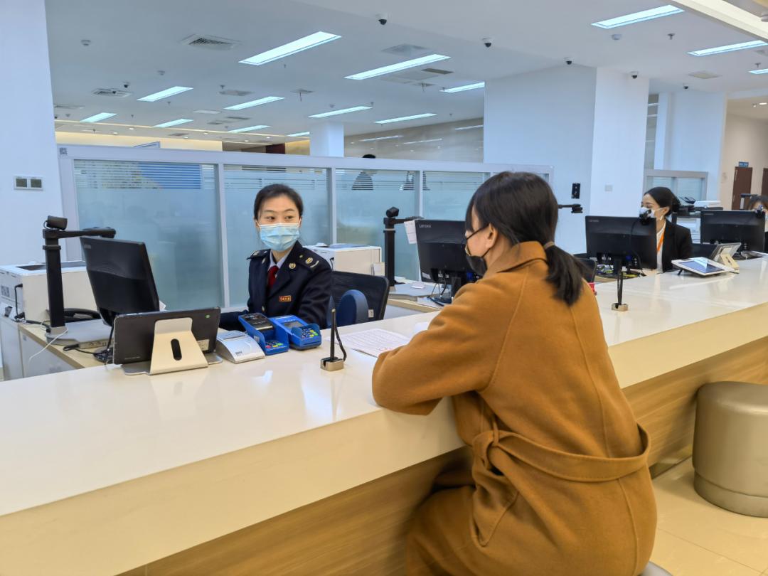图为税务干部在青岛前湾保税港区不动产交易大厅“一窗办理”纳税辅导窗口,为纳税人解答不动产业务有关问题。