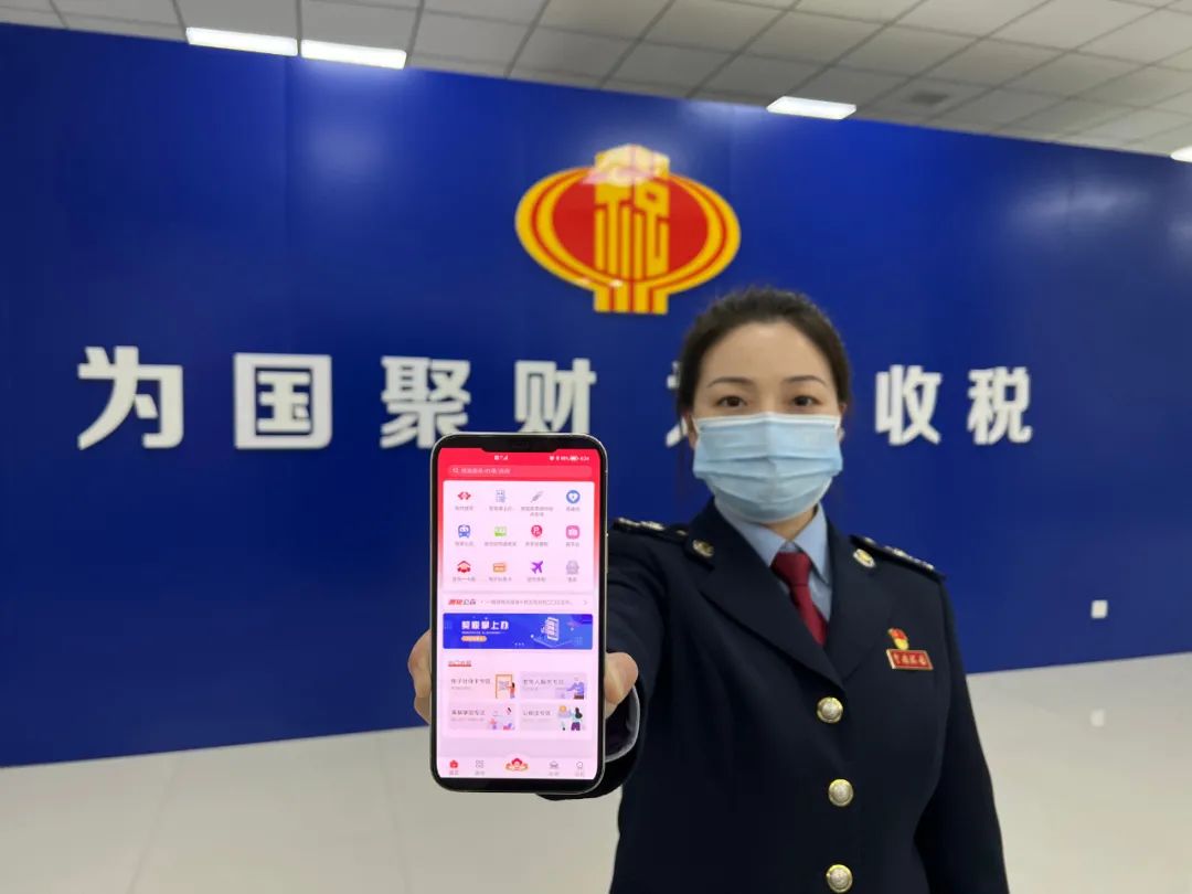 图为国家税务总局洛阳市税务局第二税务分局干部展示掌上办税平台。