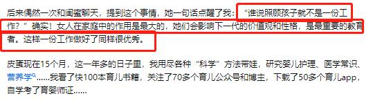 知乎上,一位95后妈妈说,原来还在犹豫要不要全职在家陪伴孩子,在一次偶尔和闺蜜聊天时,闺蜜的一句话点醒了她:“谁说照顾孩子不是一份工作?”对于这句话,她也很认同,女人是家庭最重要的教育者,她们会影响下一代的价值观和性格。