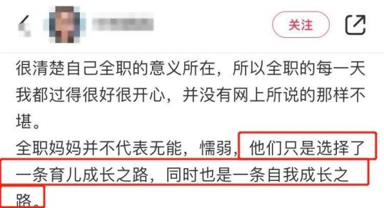 “全职妈妈并不代表无能,软弱,她们只是选择了一条育儿成长之路,同时也是一条自我成长之路。”