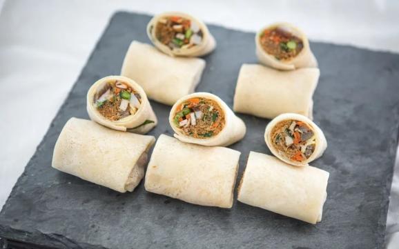 又是一个上过《舌尖上的中国》第二季的美食,也是台州人立夏、端午会吃的传统食物。传说这种食物是济公发明的,他把吃剩的食物卷起来下一顿再吃,所以也有个“济公卷饼”的别称。台州人如果在家吃食饼筒,要准备好其中包着的各种配菜,然后全家人吃饭时围坐桌前,各自拿起一张面皮,放上自己喜欢的配菜后卷成筒状来吃。