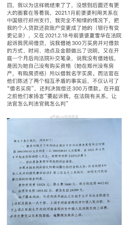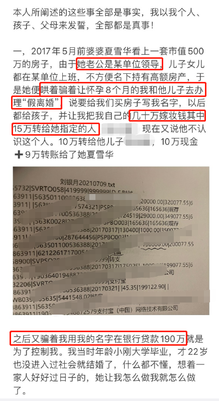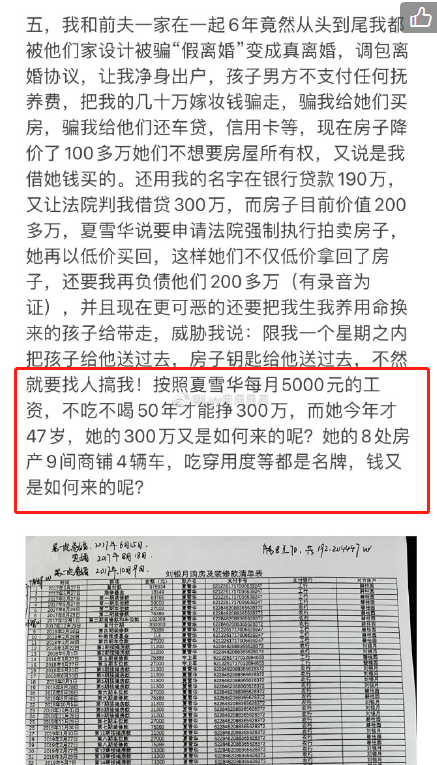 记者翻阅该网友2021年10月到12月的多条图文微博发现,该网友多次发文举报前夫一家:1.前婆婆夏雪华,系中国农业发展银行太康支行员工,不到岗工作,每月却有5000元上下的工资可拿。其一家拥有8套房产、9间商铺、4辆汽车......吃穿用度都是名牌,巨额财产来历不明。
