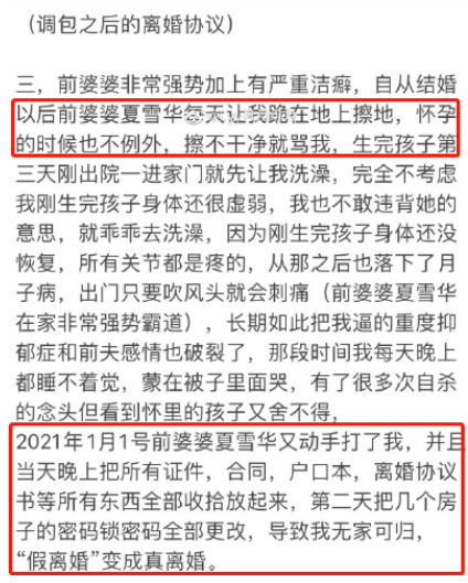 3.前夫李某和其母多次对网友进行家暴,包括在怀孕期间,让网友跪地清理地板等。