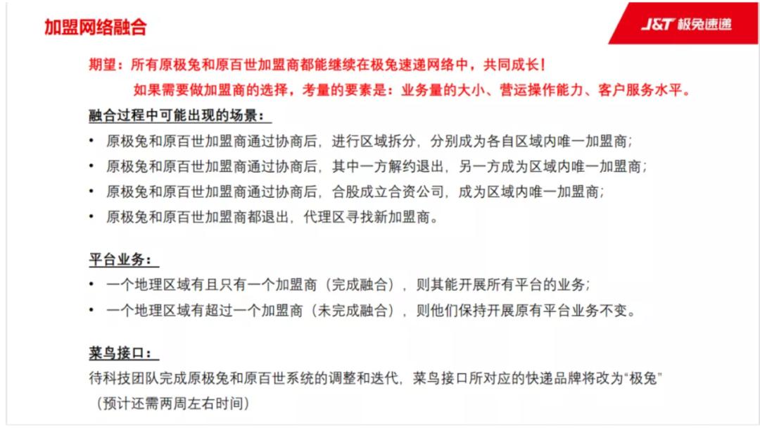 有关极兔、百世具体的融合方案,在一张网络热传的融合方案里,极兔先给加盟商吃了一颗“定心丸”。基于希望大家都能够留下的初衷,针对同一区域双方的加盟商,提供四种场景和解决方案,原则上是希望双方加盟商都能够继续经营。