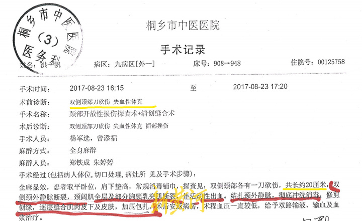 案发第5天,桐乡市公安司法鉴定中心的鉴定书显示,洪某某颈前部左侧10cm皮肤裂创,右侧10.5cm皮肤裂创。这与案发当天,桐乡市中医医院手术记录基本一致。根据桐乡市中医医院手术记录,洪某某双侧颈部各有一刀砍伤,共长约20cm。